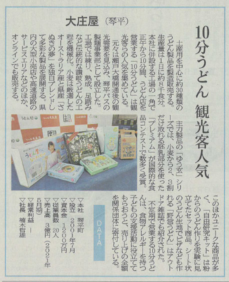 土産用を中心に約30種類のうどん製品を製造販売する。生産量は1日に約8千食分。本社に併設する工場の一角で正午から10分間、うどん店を営業する「10分うどん」は観光客からの人気を集めている。