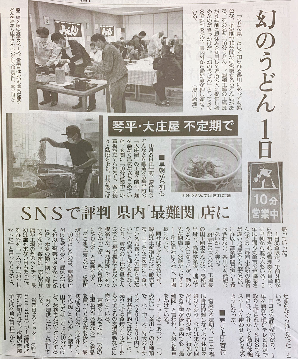 「うどん県」として知られる香川にあっても異色な、不定期で10分だけ営業するうどん店がある。その名も「10分うどん」。製麺工場の工場長が6年前に昼休みを利用して近所の人に提供し始めたのがきっかけだ。「幻のうどん」としてSNSで評判を呼び、県内外から愛好家が押し寄せている。