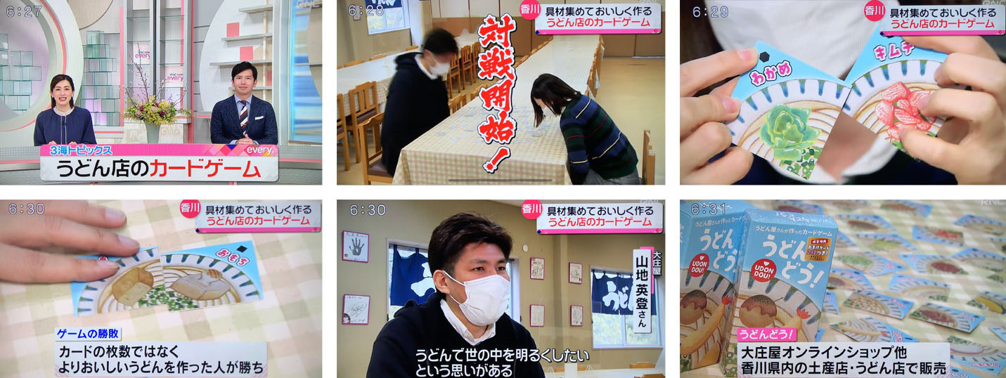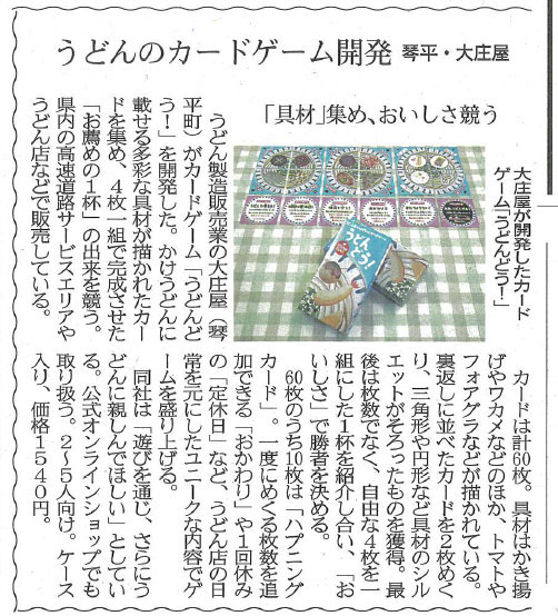 うどん製造販売業の大庄屋(琴平町)がカードゲーム「うどんどう!」を開発した。うどんに乗せる多彩な具材が描かれたカードを集め、4枚一組で完成させた「お薦めの一杯」の出来を競う。県内の高速道路サービスエリアやうどん店などで販売している。